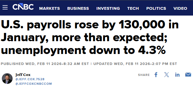 Phase 1: The Gaslight (The CNBC Headline): On February 11th, the BLS released data that CNBC and mainstream outlets immediately hailed as positive. They focused entirely on the "surprise" January job growth, celebrating a headline number that beat expectations. This celebration ignored the fact that the same report contained massive downward revisions for the entirety of 2025, showing how unreliable the initial print has become.